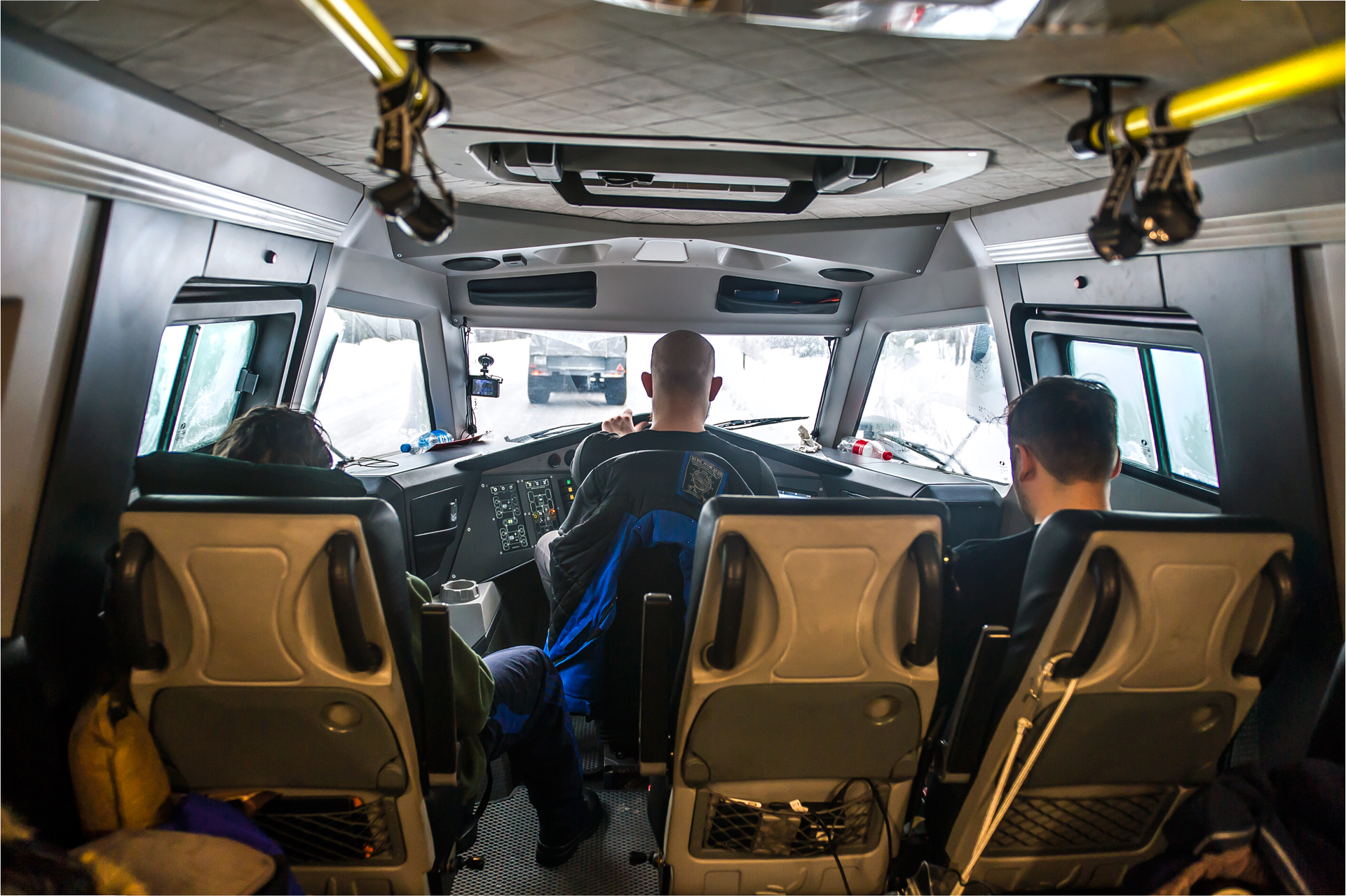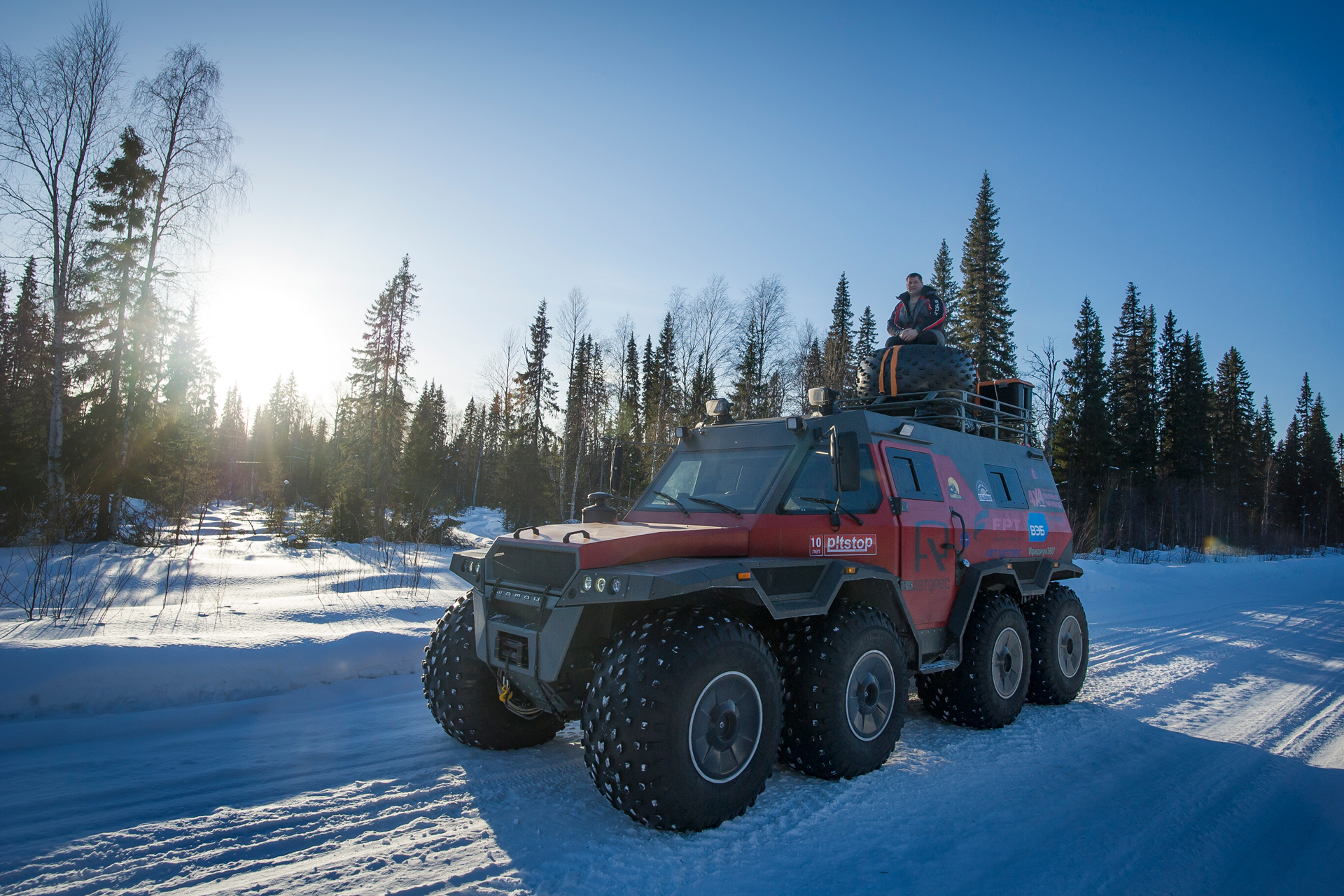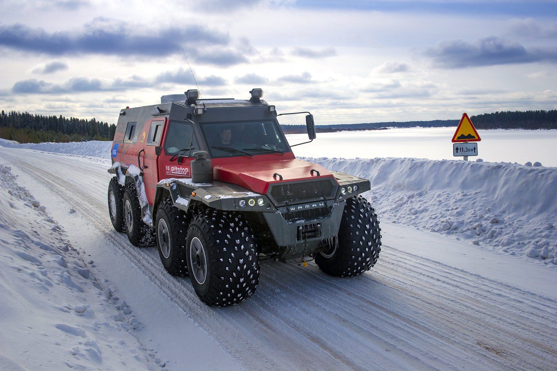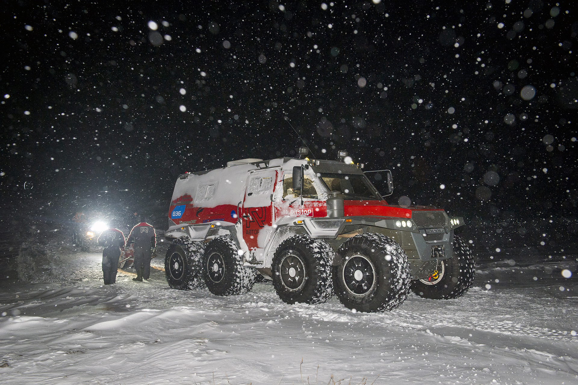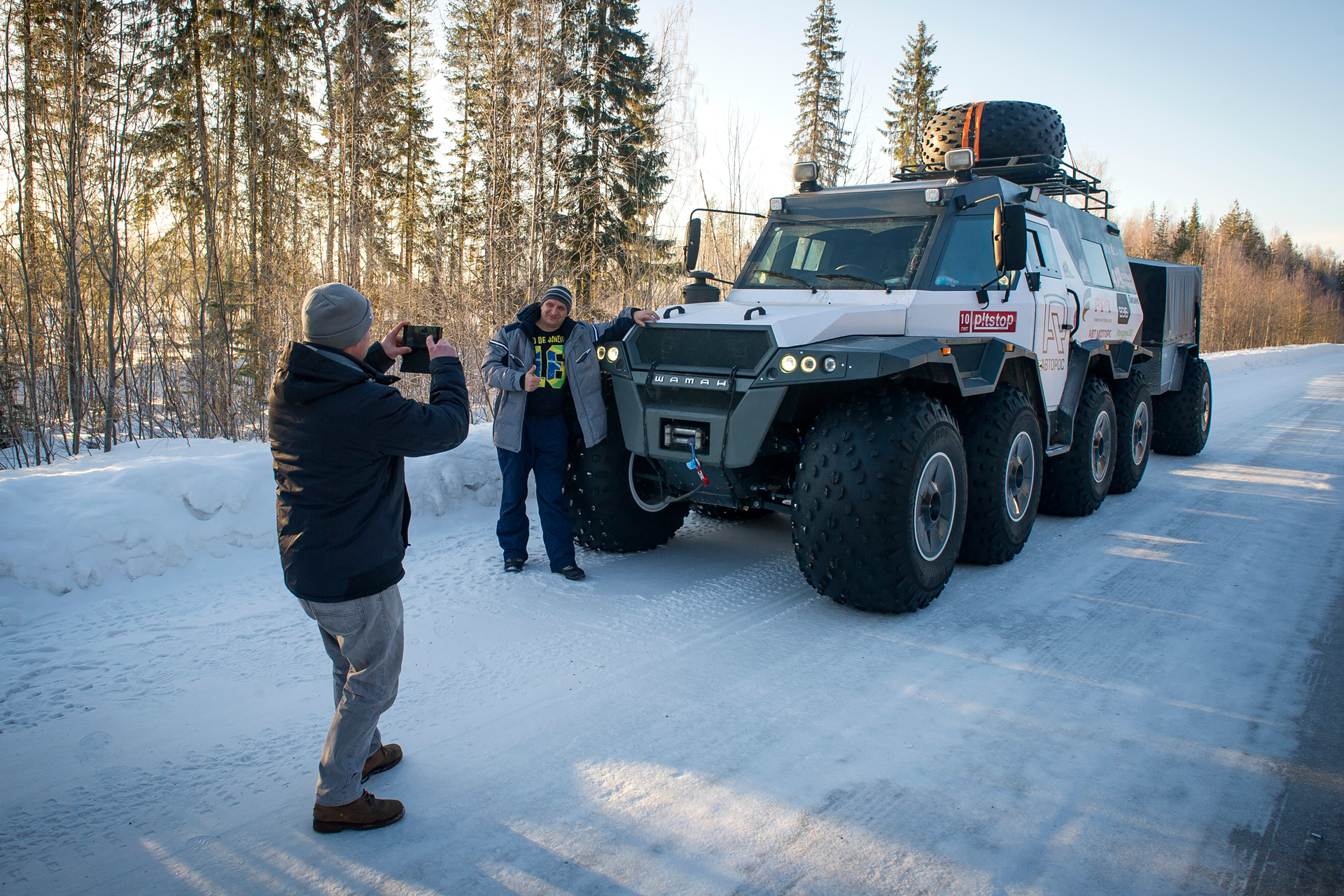 The first hundred kilometers we traveled in a strong snowstorm, snow swept the road and covered the windshield, the wipers were freezing, but after Bezhetsk the weather improved. In Vologda Region, the roads were covered with ice, but all-terrain vehicles rode along them quite confidently, thanks to the the weight of the cars and the number of wheels. The motorcade was headed by Pavlov’s “tadpole”, followed by a crew of mechanics, and a crew of journalists closed a small motorcade. We were driving together, although not fast: cruising speed was about 55-60 km /h. There were still more than 1,000 km ahead - the expedition was still at the very beginning.