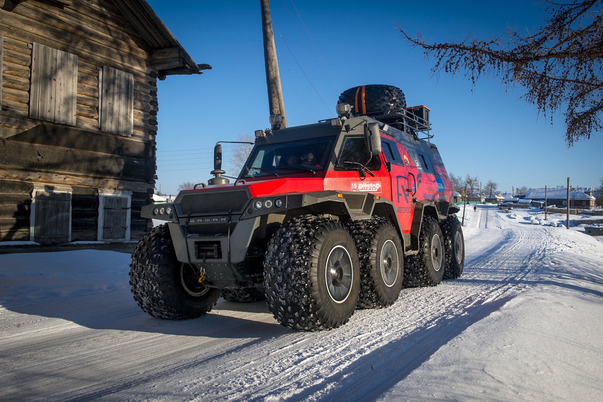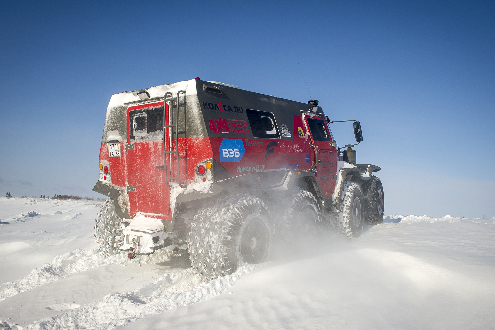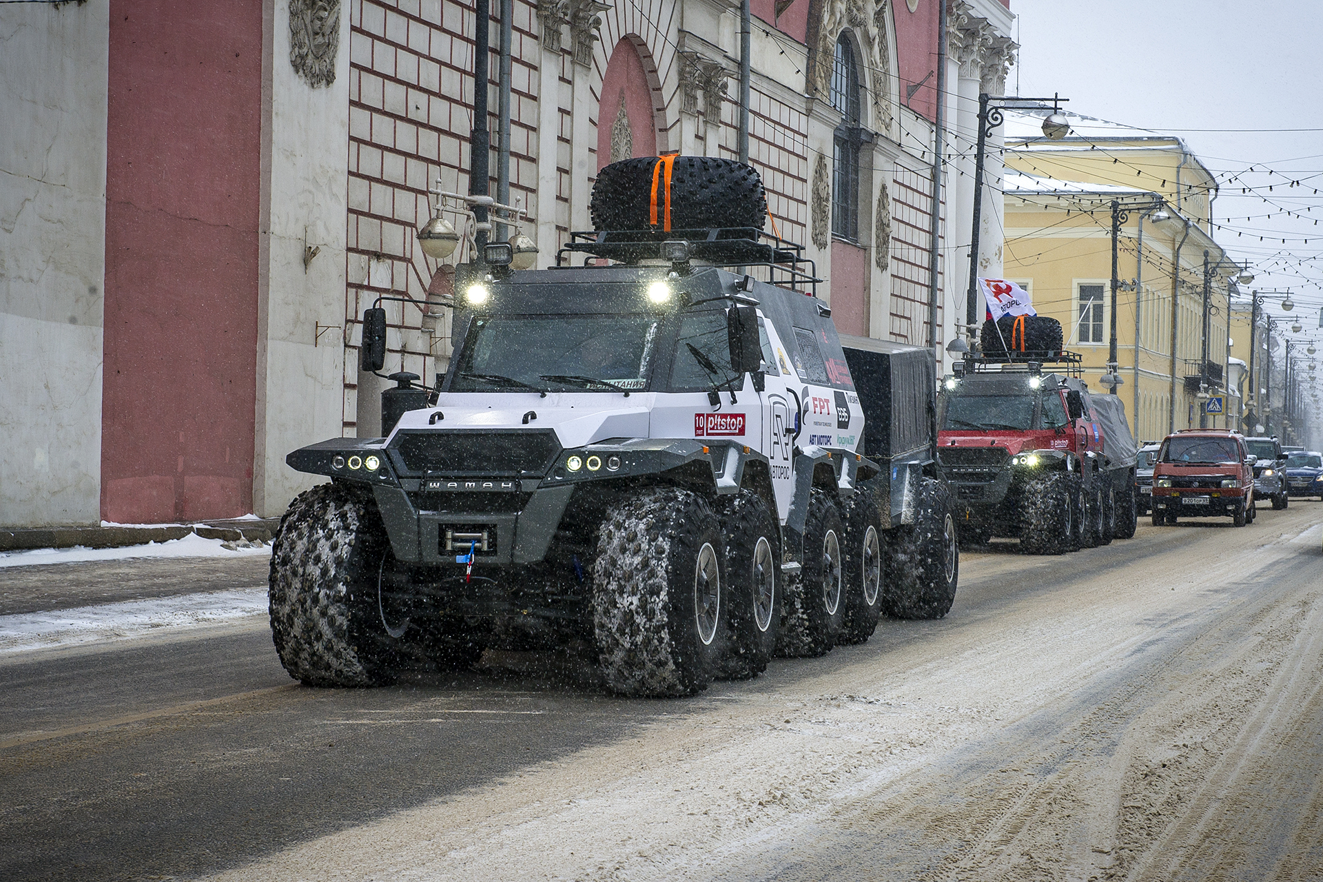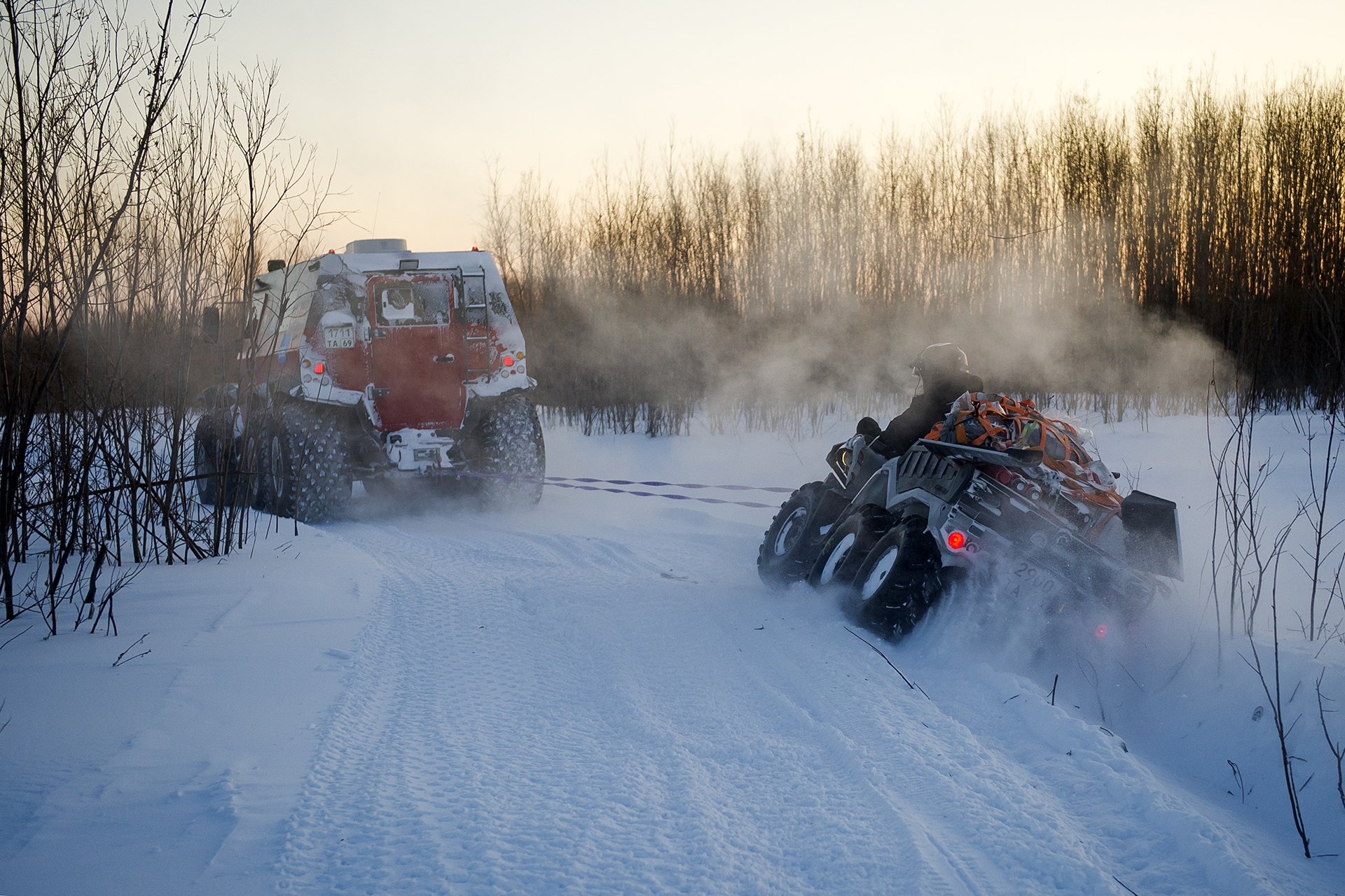 The first hundred kilometers we traveled in a strong snowstorm, snow swept the road and covered the windshield, the wipers were freezing, but after Bezhetsk the weather improved. In Vologda Region, the roads were covered with ice, but all-terrain vehicles rode along them quite confidently, thanks to the the weight of the cars and the number of wheels. The motorcade was headed by Pavlov’s “tadpole”, followed by a crew of mechanics, and a crew of journalists closed a small motorcade. We were driving together, although not fast: cruising speed was about 55-60 km /h. There were still more than 1,000 km ahead - the expedition was still at the very beginning.